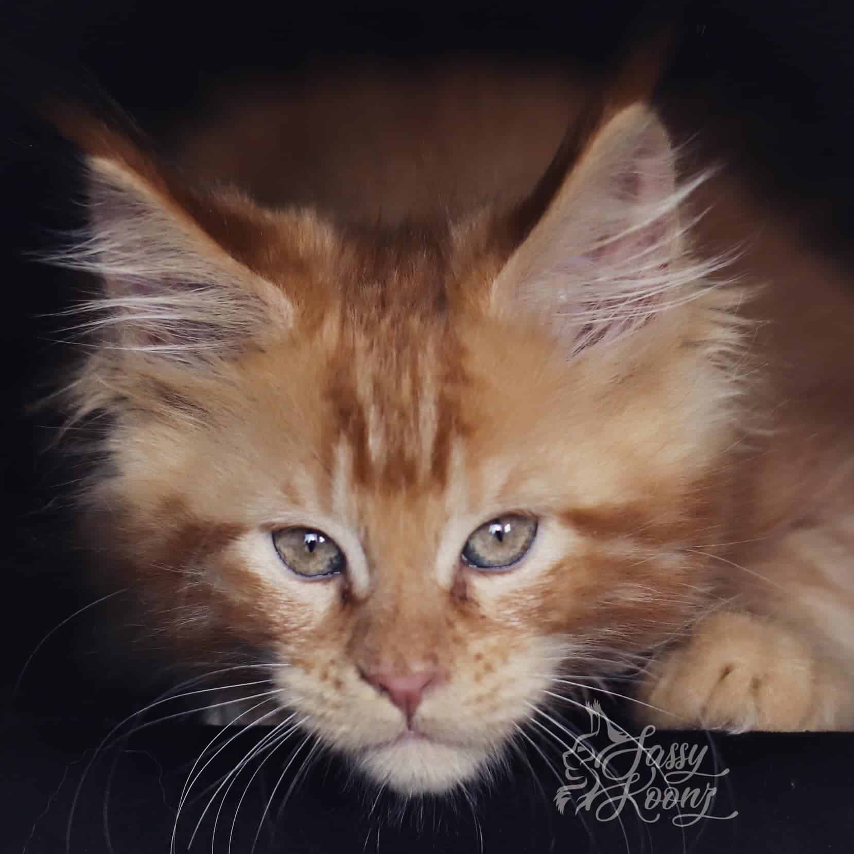 Gingerbread Man is a solid red Maine Coon kitten, which is special. The more commonly found orange Maine Coon happens to be the tabby – but this one is a solid. This coat color brings a little more richness and depth to this coat, omitting any white markings on the muzzle, legs, and ears.